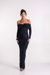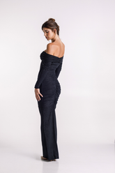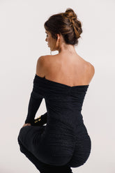 Turn heads in the Irina Glitter Dress, featuring an off-shoulder neckline and sparkling black glitter fabric. Designed with flattering ruching in the front and bottom, this body-hugging style highlights your curves and is perfect for your next night out